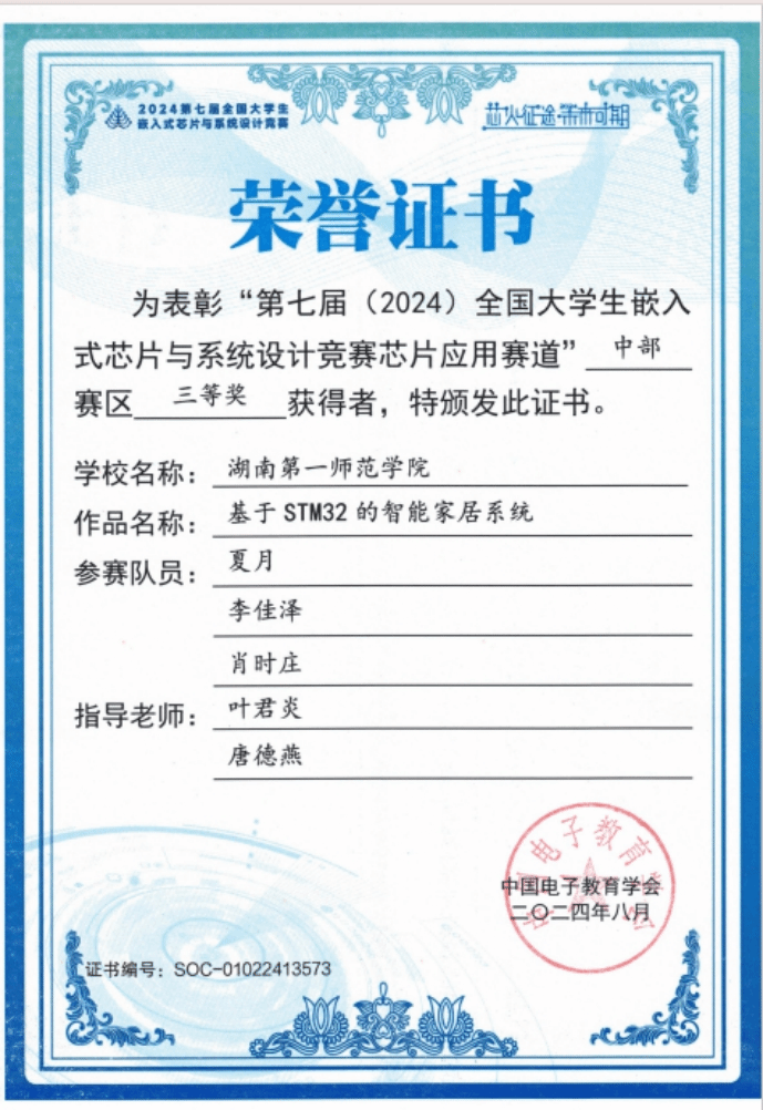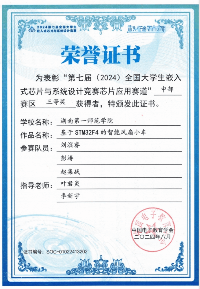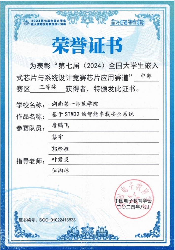 第七届(2024)全国大学生嵌入式芯片与系统设计竞赛圆满收官。该竞赛由中国电子学会主办、东南大学承办,是面向全国高校学生的权威赛事,已连续 4 年入选 “全国普通高校大学生竞赛排行榜”。此次比赛竞争激烈,bat365官网首次组队参赛,在指导老师叶君炎的精心指导下,参赛学生凭借扎实专业知识与拼搏精神,于中部赛区荣获三等奖 3 项。