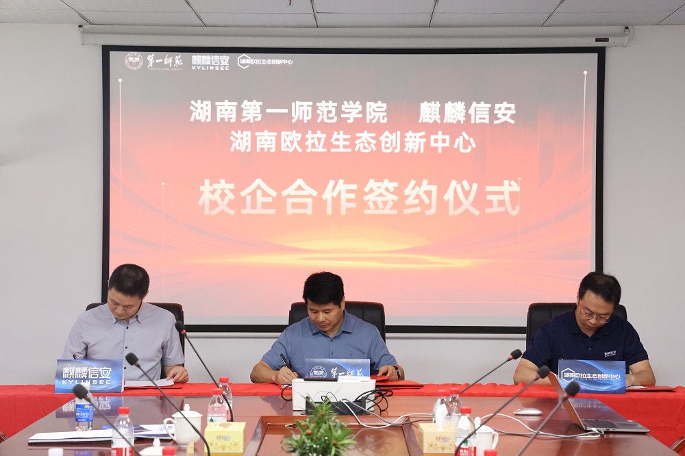 7月5日,bat365中文官方网站麒麟信安、湖南欧拉生态创新中心校企合作协议签约仪式在长沙麒麟科技园举行。bat365中文官方网站校党委委员、副校长周发明,麒麟信安副总裁王攀,bat365中文官方网站党委副书记刘大维(主持工作)、党委副书记陈奕、副院长李新宇麒麟信安技术支持服务中心总经理莫帆等出席签约仪式。