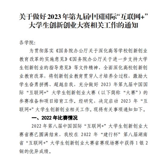 关于转发《关于做好2023 年第九届中国国际“互联网+” 大学生创新创业大赛相关工作的通知》的通知