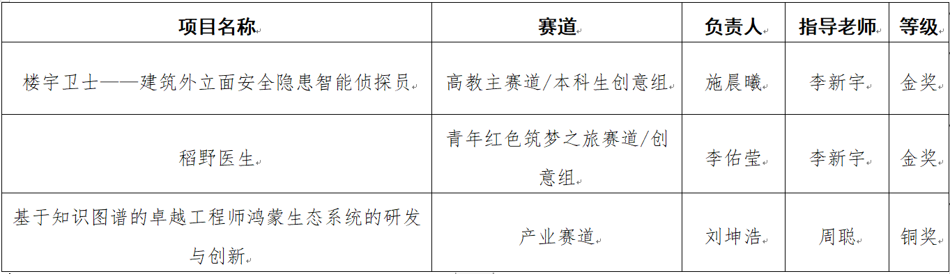 经过长达三个月的激烈角逐,院《楼宇卫士——建筑外立面安全隐患智能侦探员》团队荣获高教主赛道本科生创意组省级金奖;《稻野医生》团队荣获青年红色筑梦之旅赛道创意组省级金奖;《基于知识图谱的卓越工程师鸿蒙生态系统的研发与创新》团队荣获产业赛道省级铜奖。